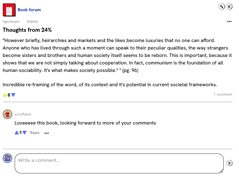Though it looks essentially like a slightly modded comment section, its separation from the review section makes the experience more organized. More purposeful. Sometimes I just need to find someone who is also at 24% of the book, thinking “wow, I feel pretty mind blown right now.”